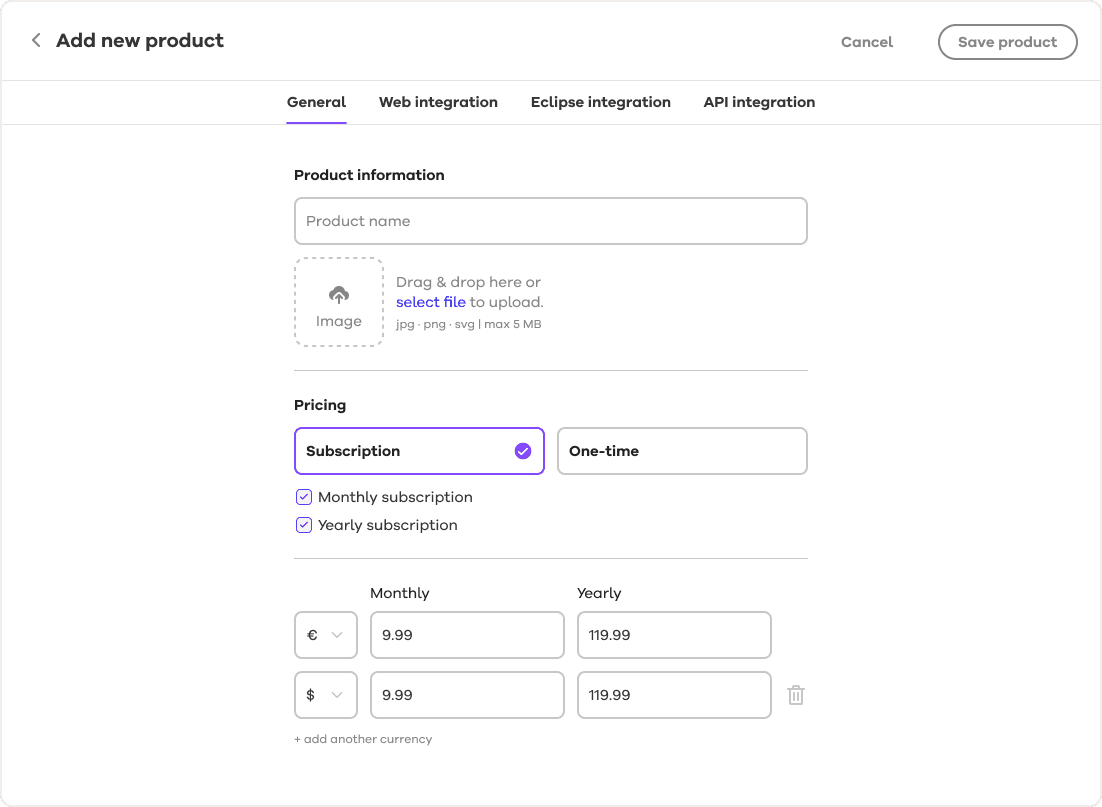 Note: Once you have created a product, you cannot change the license type (subscription or one-time purchase). However, you can contact us (checkout@yatta.de) to change it for you.