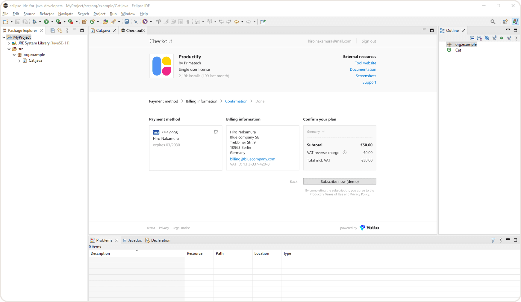 See Yatta Checkout's complete integration guide for additional features, such as event handlers and license management for Eclipse.