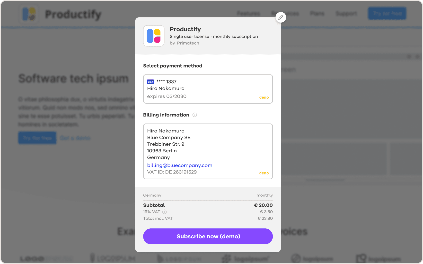 Note: No emails are sent for demo purchases, but you can download the demo invoice directly on the purchase confirmation page to see how it looks.