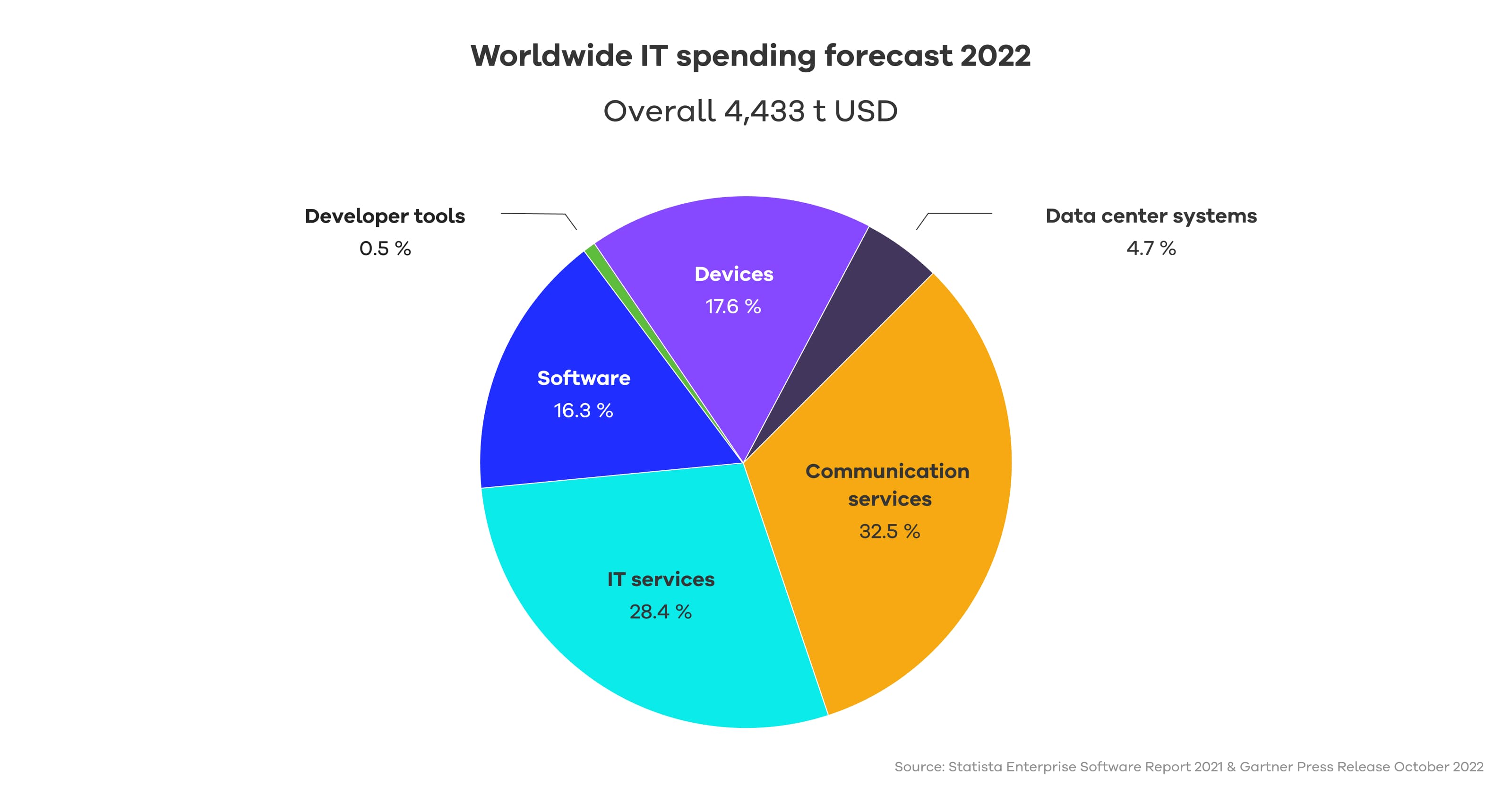 This sounds impressive, but it’s a drop in the ocean when compared with the overall IT market: In 2022, we are projected to spend over 4.4 trillion USD on IT.
