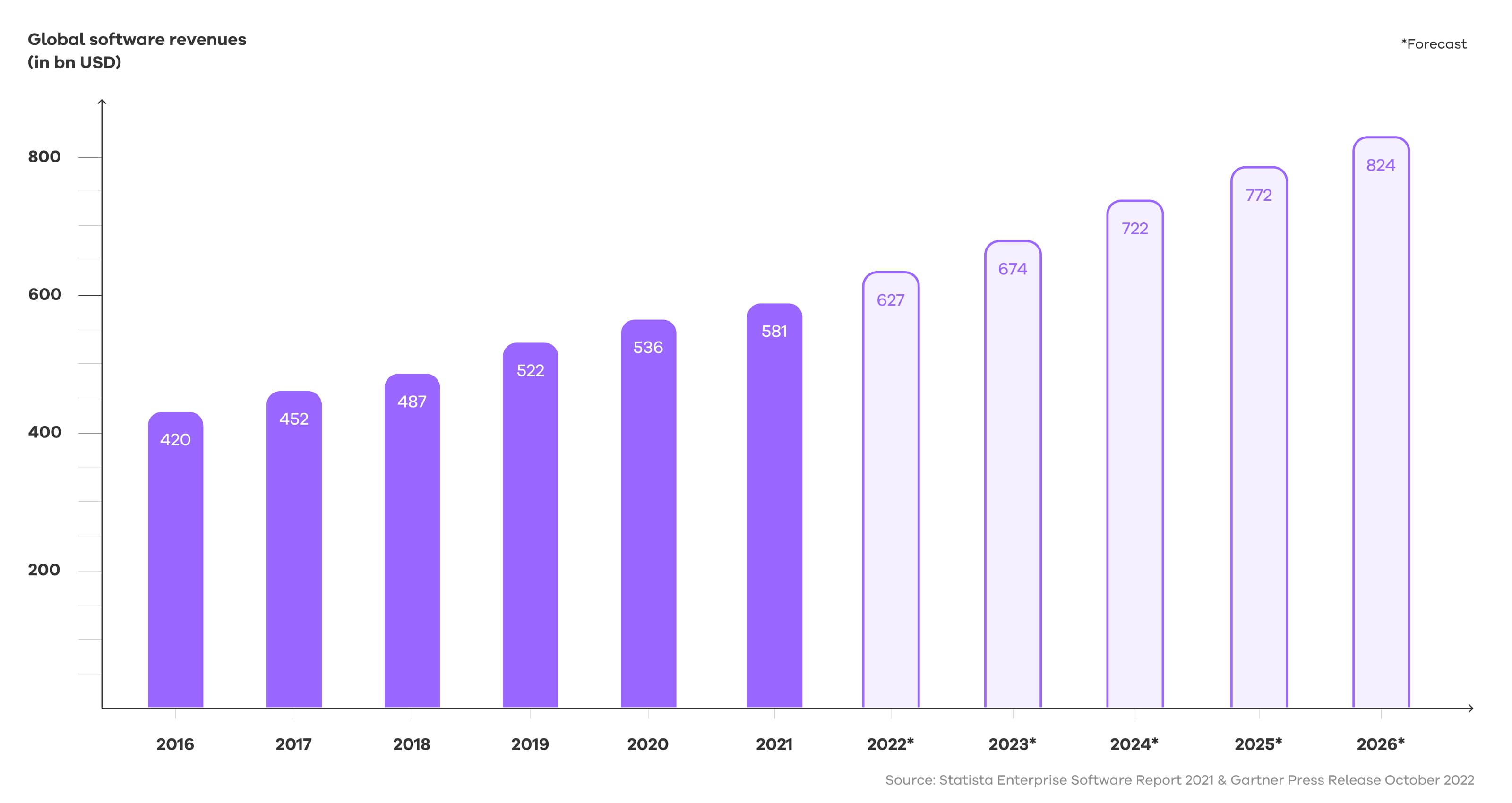 Exploding demand over the last years has led to more and more software being created faster than ever before. In 2016, software revenues amounted to around 420 billion USD worldwide. By 2026, this figure is projected to almost double to 824 billion USD.