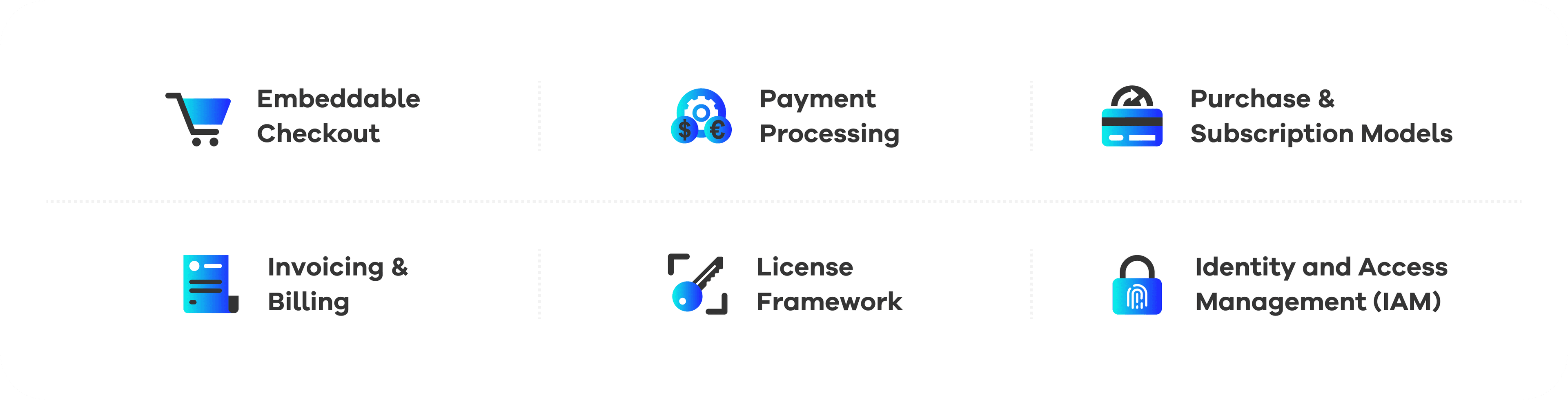There are many separate providers for each of the individual features of Yatta Checkout. But doing that will mean you spend a lot of time integrating different shop, billing and IAM solutions, negotiating with payment providers, and discussing licenses and legal agreements with (costly) lawyers.